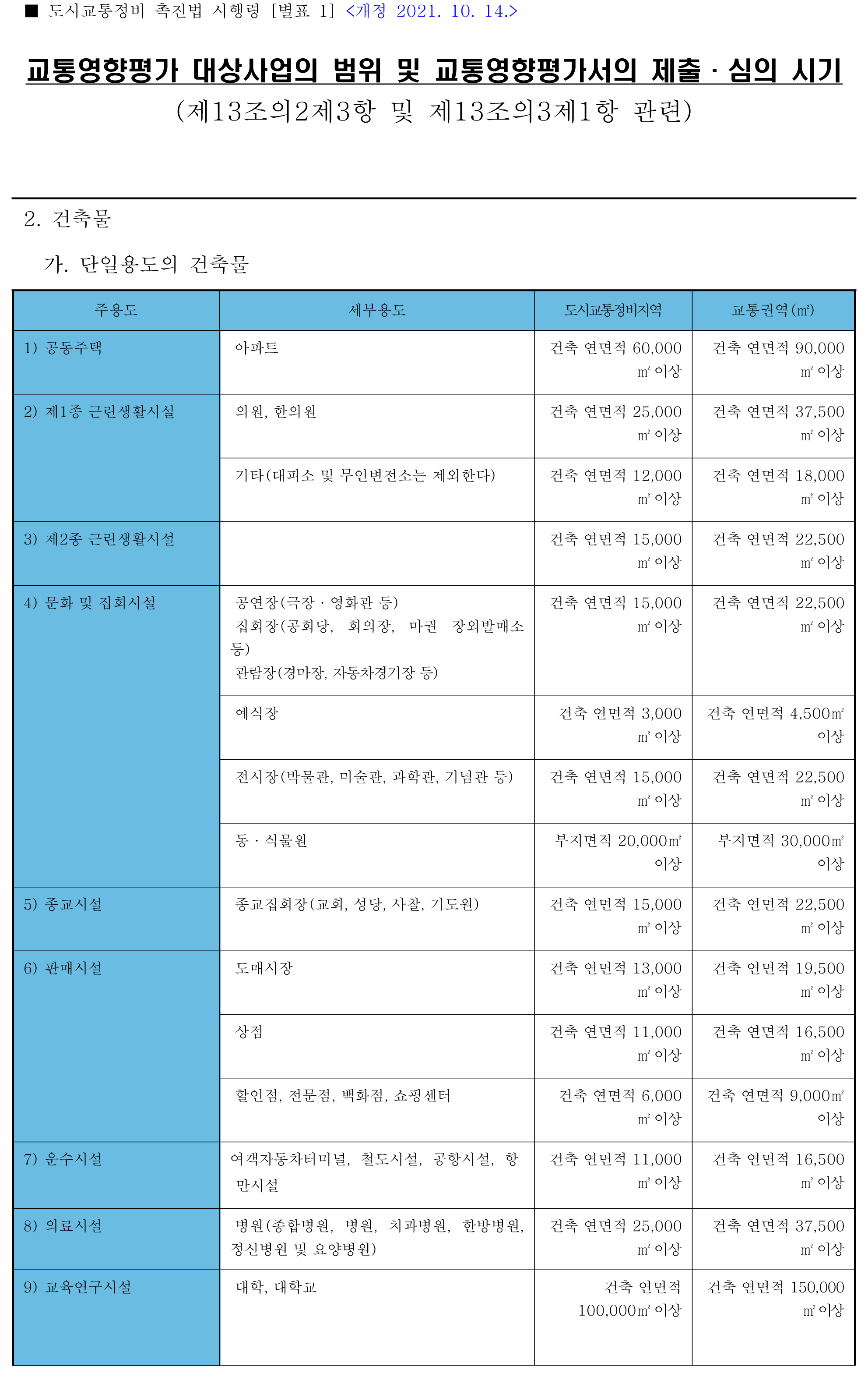 제13조의 2(교통영향평가 대상사업 등) ① 법 제15 제1항 제11호에서 “대통령령으로 정하는 건축물”이란 다음 각 호의 건축물을 말한다.