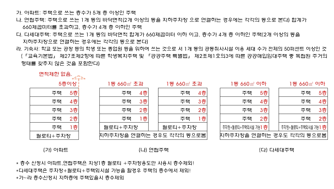 A-주택 쓰이는 층수 3개 층이하 다만, 1층의 전부 또는 일부를 필로티 구조로 하여 주차장으로 사용하고 나머지 부분을 주택(주거 목적으로 한정한다) 외의 용도로 쓰는 경우에는 해당 층을 주택의 층수에서 제외한다.