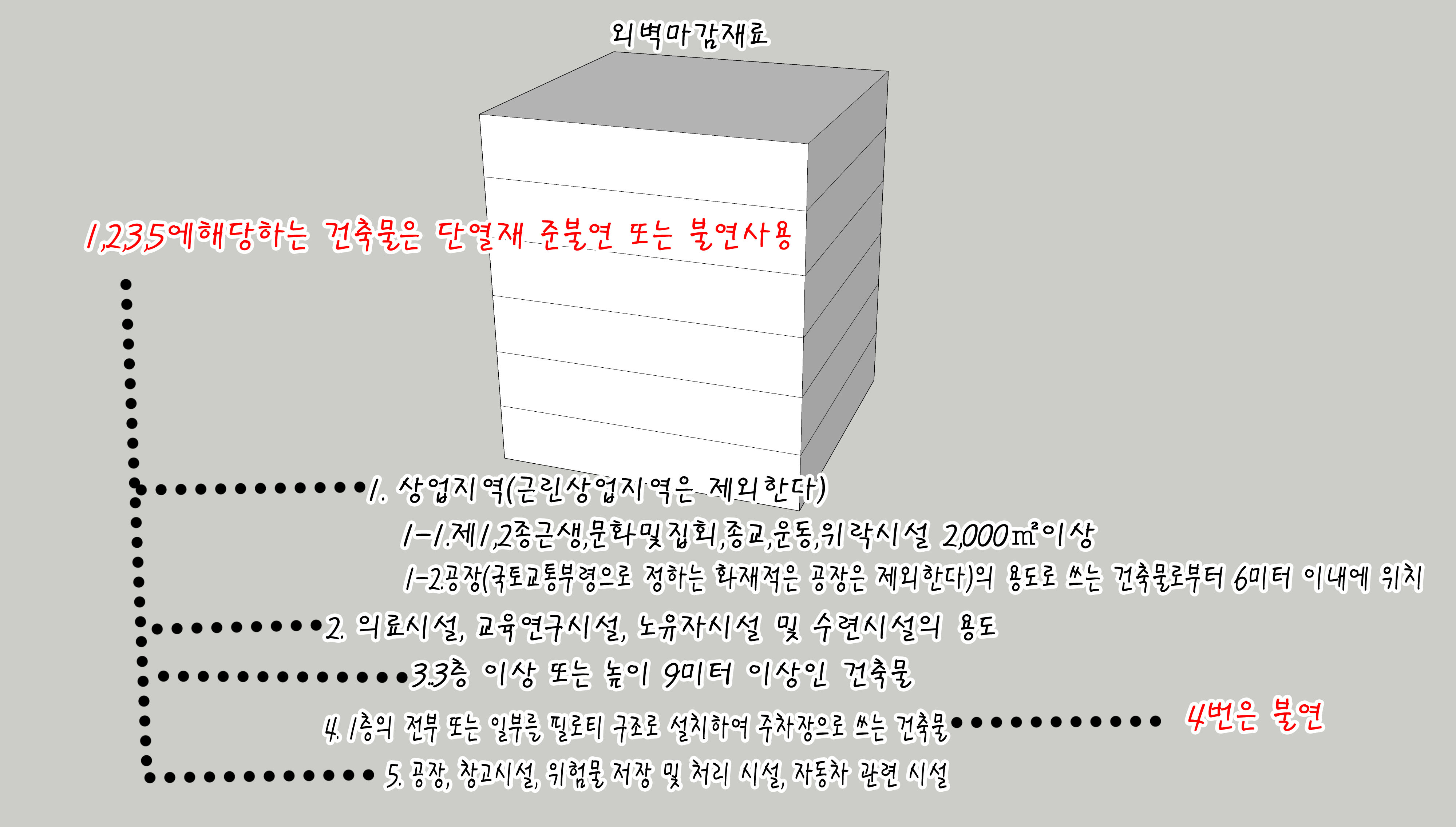 요새는 법이 바뀌어서 실내마감재료 및 외벽마감재료에 대해 불연인지 준불연인지