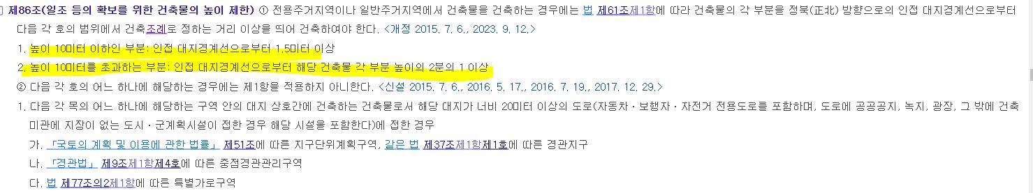 다. 일조 등의 확보를 위한 건축물 높이 제한 완화(안 제86조제1항제1호및 제2호)전용주거지역이나 일반주거지역에서 건축물을 건축하는 경우에는 종전에 정북(正北) 방향의 인접대지경계선으로부터 높이 9미터 이하인부분은 1.5미터 이상, 높이 9미터를 초과하는 부분은 건축물 각 부분높이의 2분의 1 이상을 띄우도록 하던 것을<변경전>