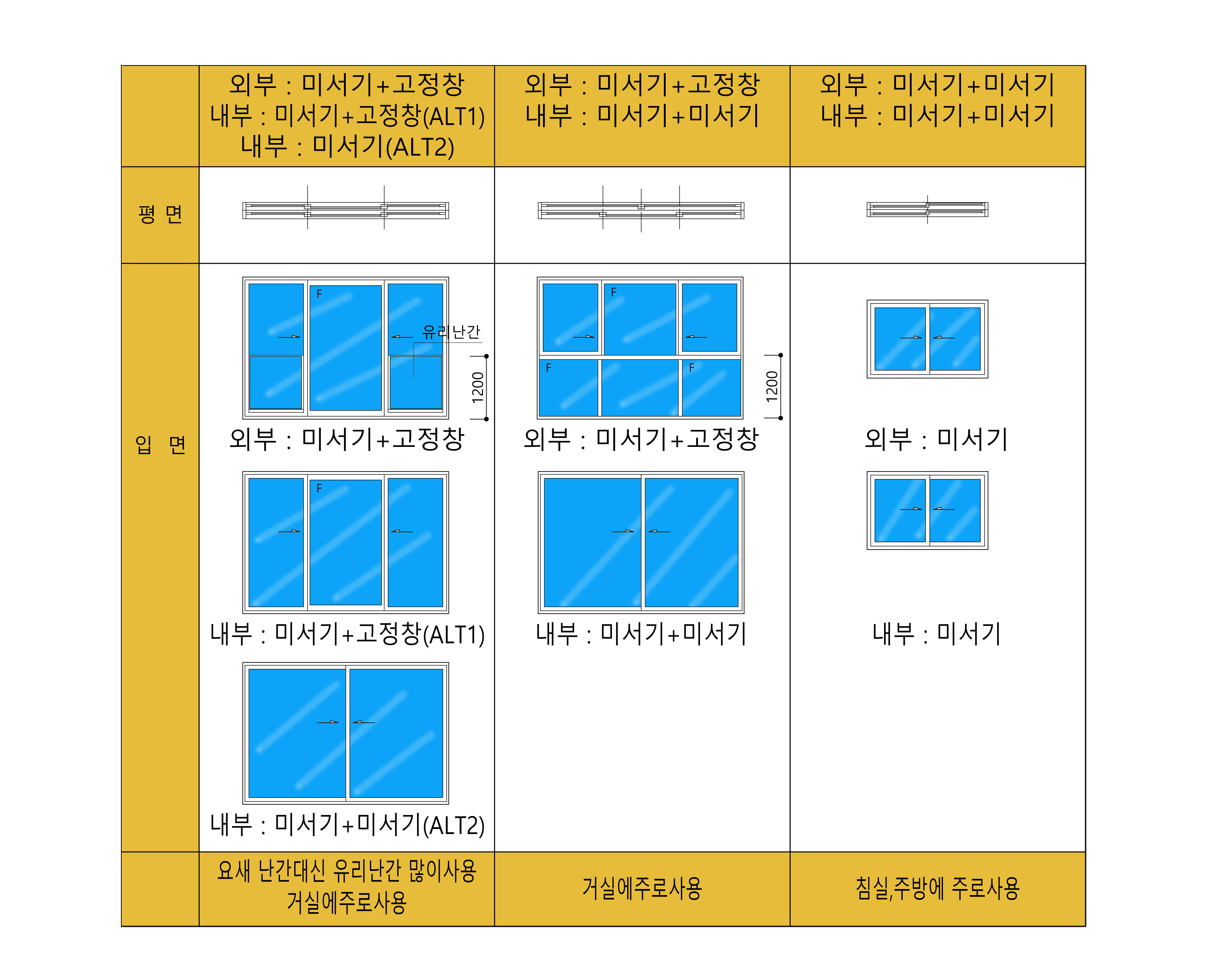 고정창을 혼합하여 미서기+고정창, 프로젝트+고정창등 다양하게 활용이 가능합니다.